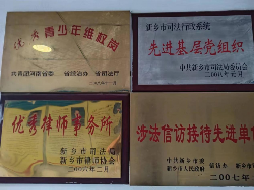 十八年来,恒升律所因工作突出、成绩显著,先后被共青团河南省委、河南省司法厅、河南省妇联、河南省律师协会、中共新乡市委、市政府、新乡市律师协会、市信访局、市司法局党委、市妇联等领导机关评为全省律师行业党建工作示范单位、律师宣传、理论调研工作先进单位、律师事务所规范化建设先进单位、涉法信访接待工作先进单位、扶持培养青年律师先进单位、律师队伍社会主义法治理念教育先进集体、先进基层党组织、先进党支部、维护妇女儿童权益先进集体、优秀青少年维权岗等荣誉称号。