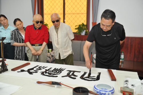 活动现场长案铺展,宣纸洁白,墨香四溢。书法家们挥毫泼墨,他们凝神聚气,笔走龙蛇,或遒劲有力,或飘逸洒脱。他们根据老干部的需求,写下“祖国万岁”“不忘初心”“永葆本色”“鹤寿”等饱含热爱与坚守的书法作品,一笔一划间尽显中华书法的神韵与魅力,赢得老干部们的连连称赞。老干部们围聚在书桌旁,时而凝神欣赏书法老师们的创作过程,时而与书法老师们交流书法技巧与心得。今年已96岁高龄的吴玉春老首长看着面前苍劲有力的永葆本色四个大字,激动地说:“只有永葆共产党员的本色,才能坚守初心使命,始终坚定不移地跟党走。”