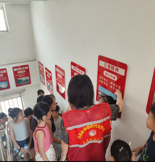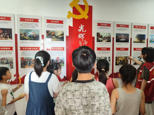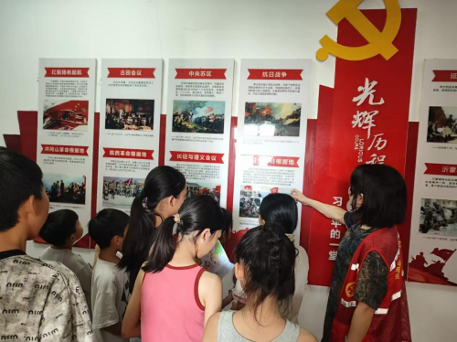 活动中,孩子们在社区关工委工作人员的带领下,来到了社区的党史教育室。室内陈列着丰富的党史资料和珍贵的历史照片,工作人员薛小芳生动地为孩子们讲述了党的光辉历程,从嘉兴南湖的红船起航,到八一南昌起义的第一声枪响,再到新中国的成立,孩子们听得聚精会神,眼神中满是好奇与崇敬。
