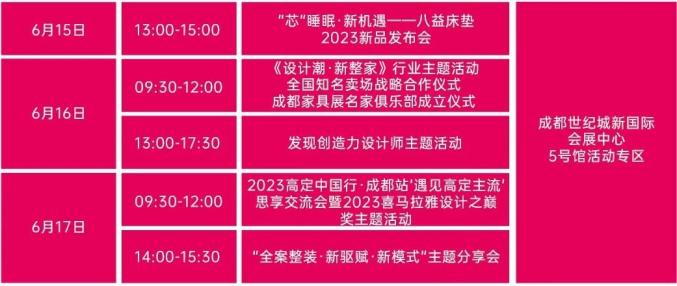 展会期间,还将陆续举办“产业组织结构与平台创新举措沙龙”、《设计潮·新整家》行业主题活动、全国知名卖场战略合作仪式、成都家具展名家俱乐部成立仪式、发现创造力设计师主题活动、2023高定中国行·成都站“遇见高定主流”思享交流会暨2023喜马拉雅设计之巅奖主题活动等近10场家居行业主题活动。