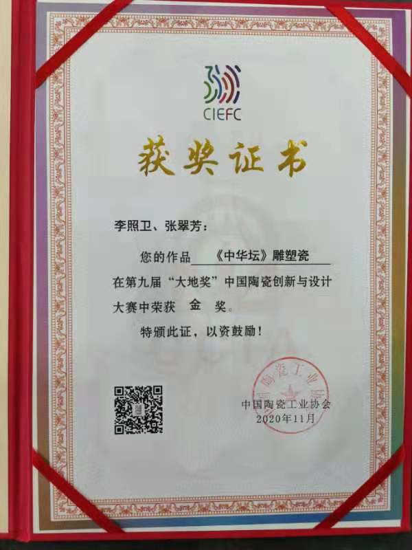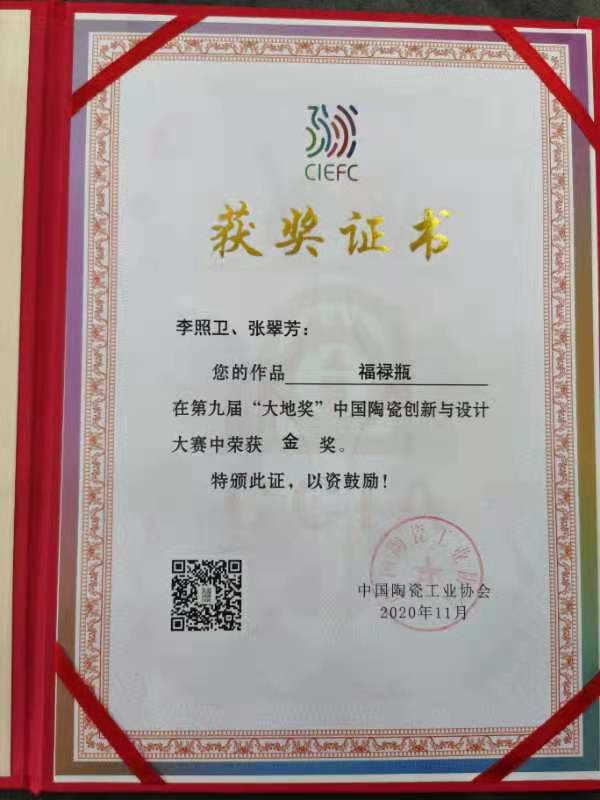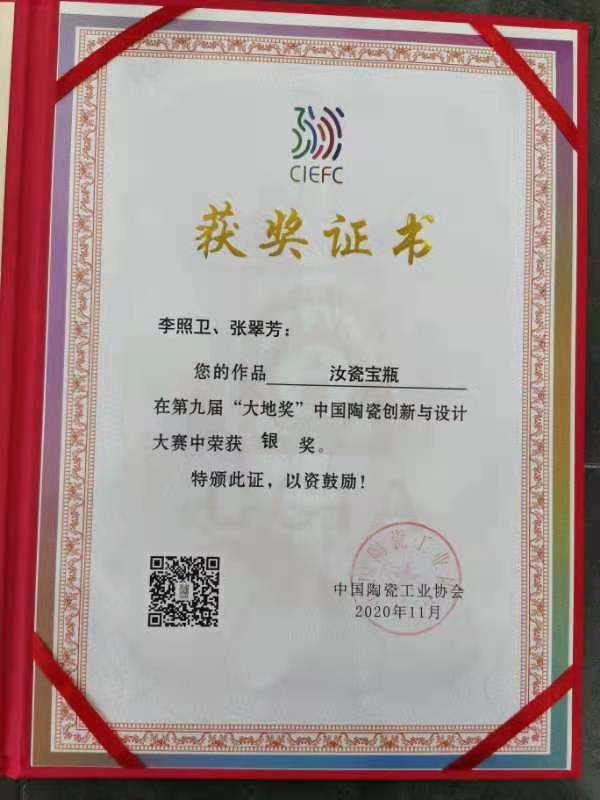 河南讯(田聚成 王长安 王恒平)报道 近日,记者从廷怀窑获悉,在日前举行的中国(北京)国际精品陶瓷展览会暨第九届“大地奖”中国陶瓷创新与设计大赛上,由廷怀窑选送的三件作品福禄瓶、中华坛雕塑、汝瓷宝瓶三件珍品斩获2金、1银奖。